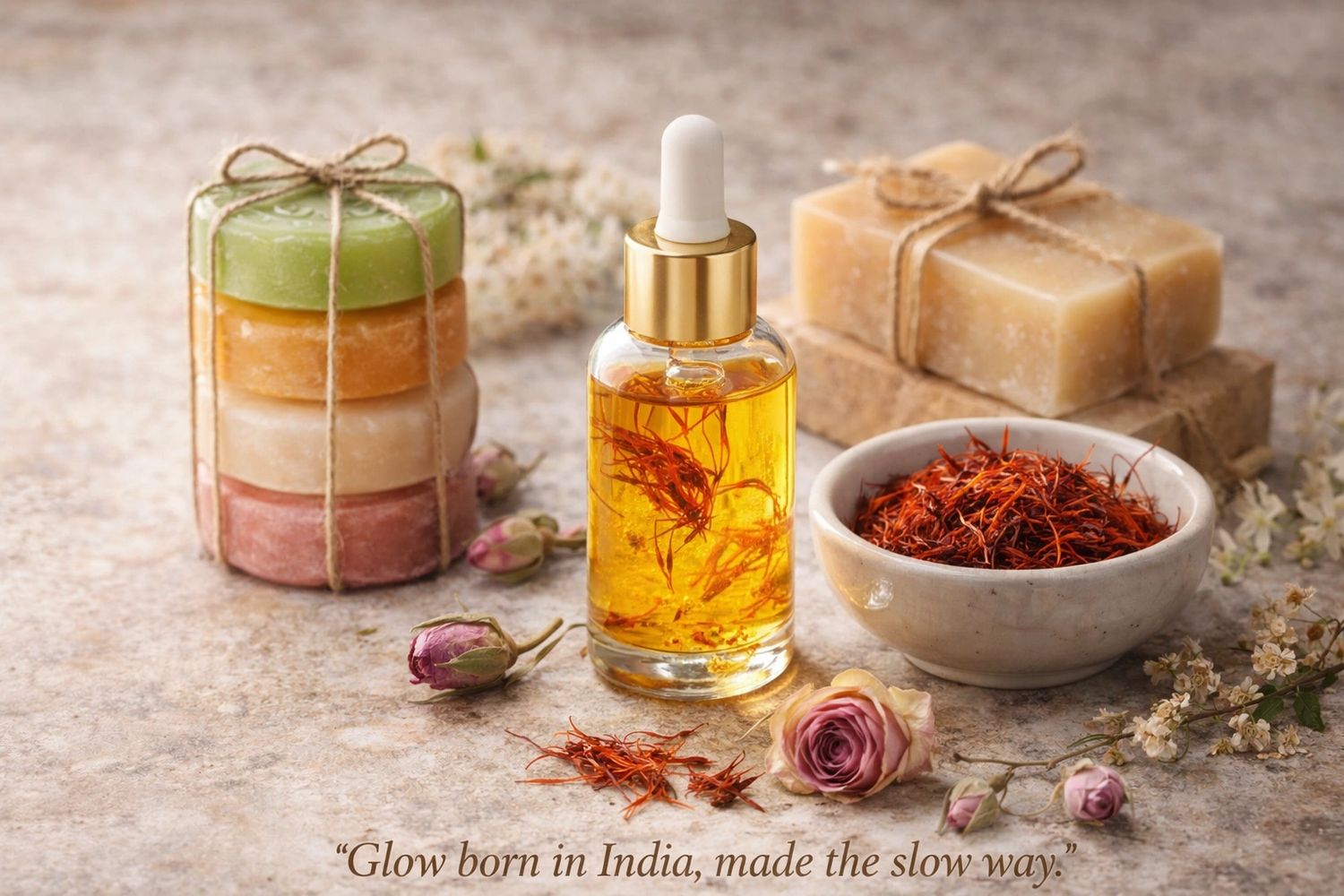 “Infused with pure saffron, almond, and rose oils — this golden bar brightens, nourishes, and restores your skin’s natural glow. Deeply hydrating and antioxidant-rich, it softens fine lines and promotes luminosity.”